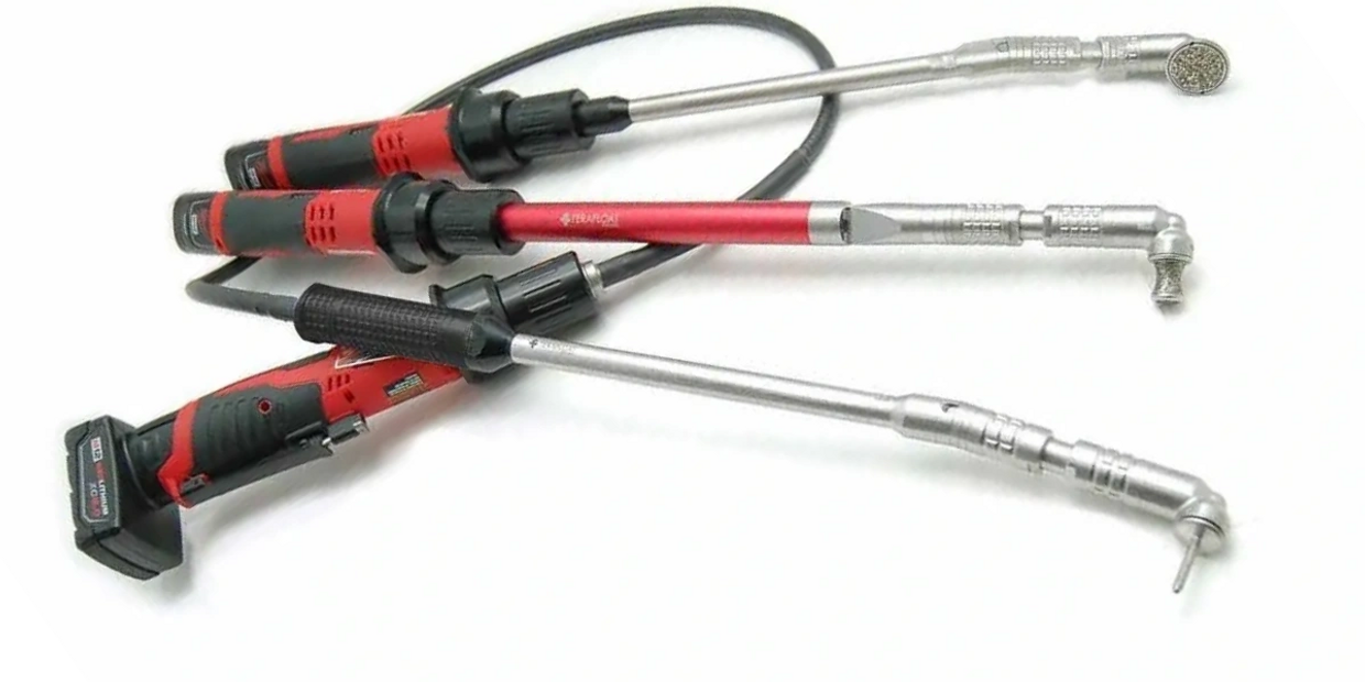 The FLX line uses a flexdrive with a sturdy drive cable. The handpieces are easily changed with magnetic connection. The motor is attached to a belt with a holster for the grinding handpieces. This lightweight instrument has all the other features of the Terafloat This line is more popular in Europe and it is the perfect solution for the one handed treatment technique.